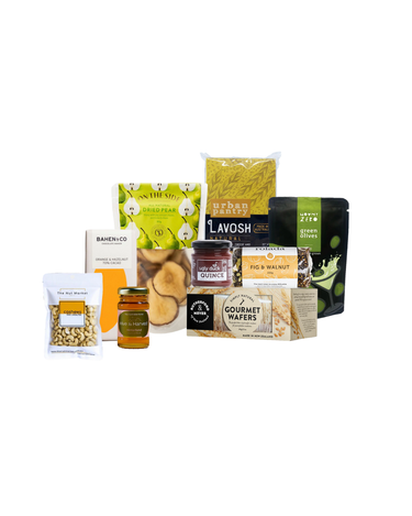 cashews (150g), orange & hazelnut chocolate (75g), honey (100g), dried pears (80g), wafer crackers (60g), lavosh (160g), olives (150g), rolada (150g) and seasonal paste (115g)